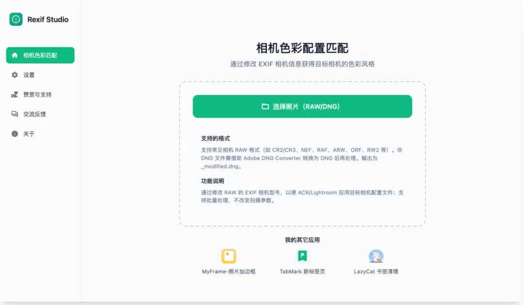 这是一款专为摄影师设计的相机RAW文件EXIF编辑工具。通过修改RAW文件中的EXIF信息,使得Adobe Camera Raw和Lightroom能够正确识别并应用特定相机的色彩配置文件,从而解锁任意相机的色彩风格。可以批量处理多个RAW文件,快速应用相同的色彩配置,特别适合需要统一色彩风格的摄影项目#EXIF