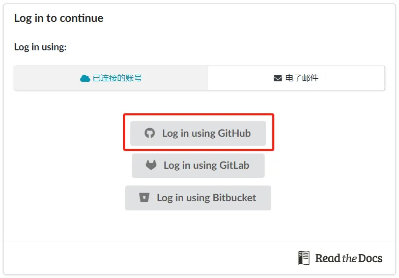 ReadTheDocs 是一个提供了托管服务的平台。我们可以把生成的 Sphinx 网页托管到这个平台上进行在线发布。首先我们需要在这个平台注册账号,不过也可以选择关联我们的 Github 账号。