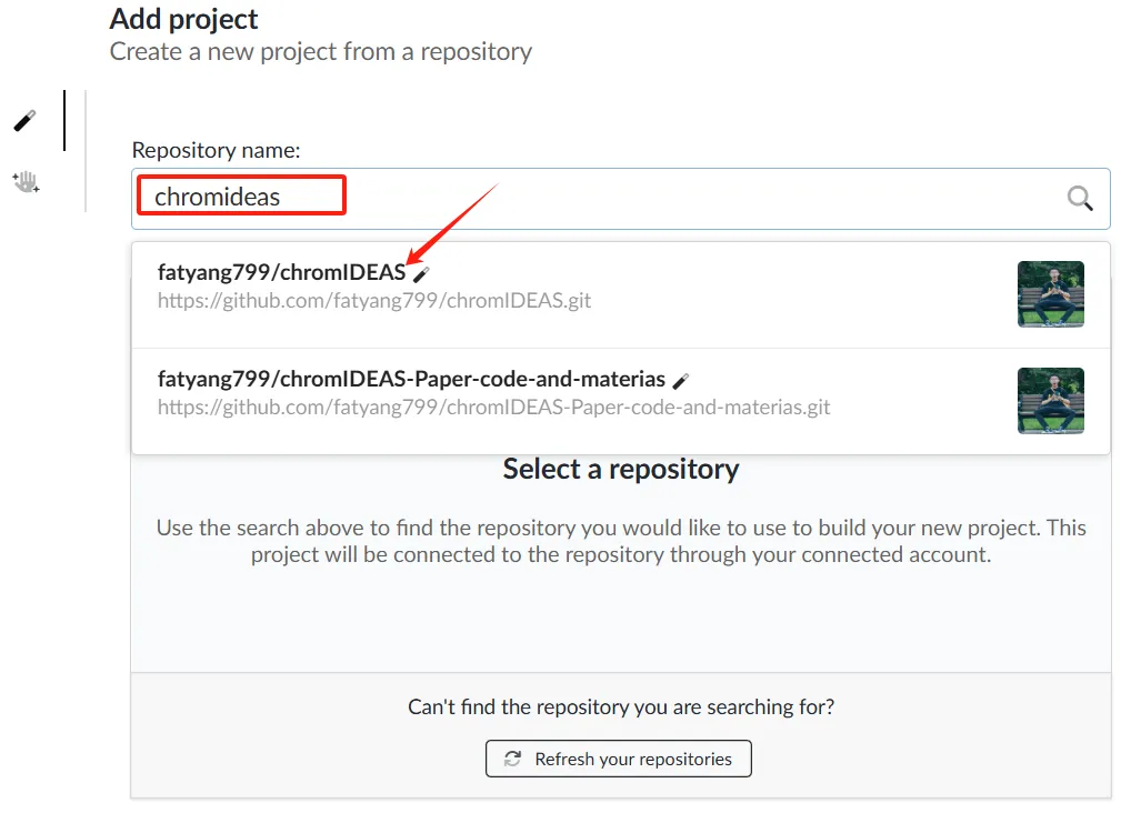 然后我们输入自己想要托管的项目,当你输入后,会自动跳出符合要求存放在 Github 上的项目: