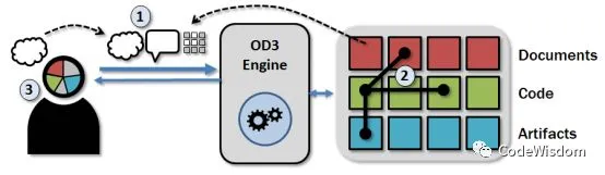 软件项目开发文档缺失或陈旧是困扰开发者、影响开发效率和质量的一个大问题。针对这一问题的传统解决方案是通过各种信息检索技术搜索各种软件开发文档、制品和代码来获取所需要的信息,但其效果十分有限。为此,软件维护与演化领域的研究者提出了按需的开发文档(On-demand Developer Documentation,简称OD3)[1]的思想。其设想如下图所示:在开发者给定的查询及上下文信息的基础上,OD3引擎动态地从各种相关的文档、代码及其他制品中抽取相关信息并动态生成易读、易理解的开发文档。