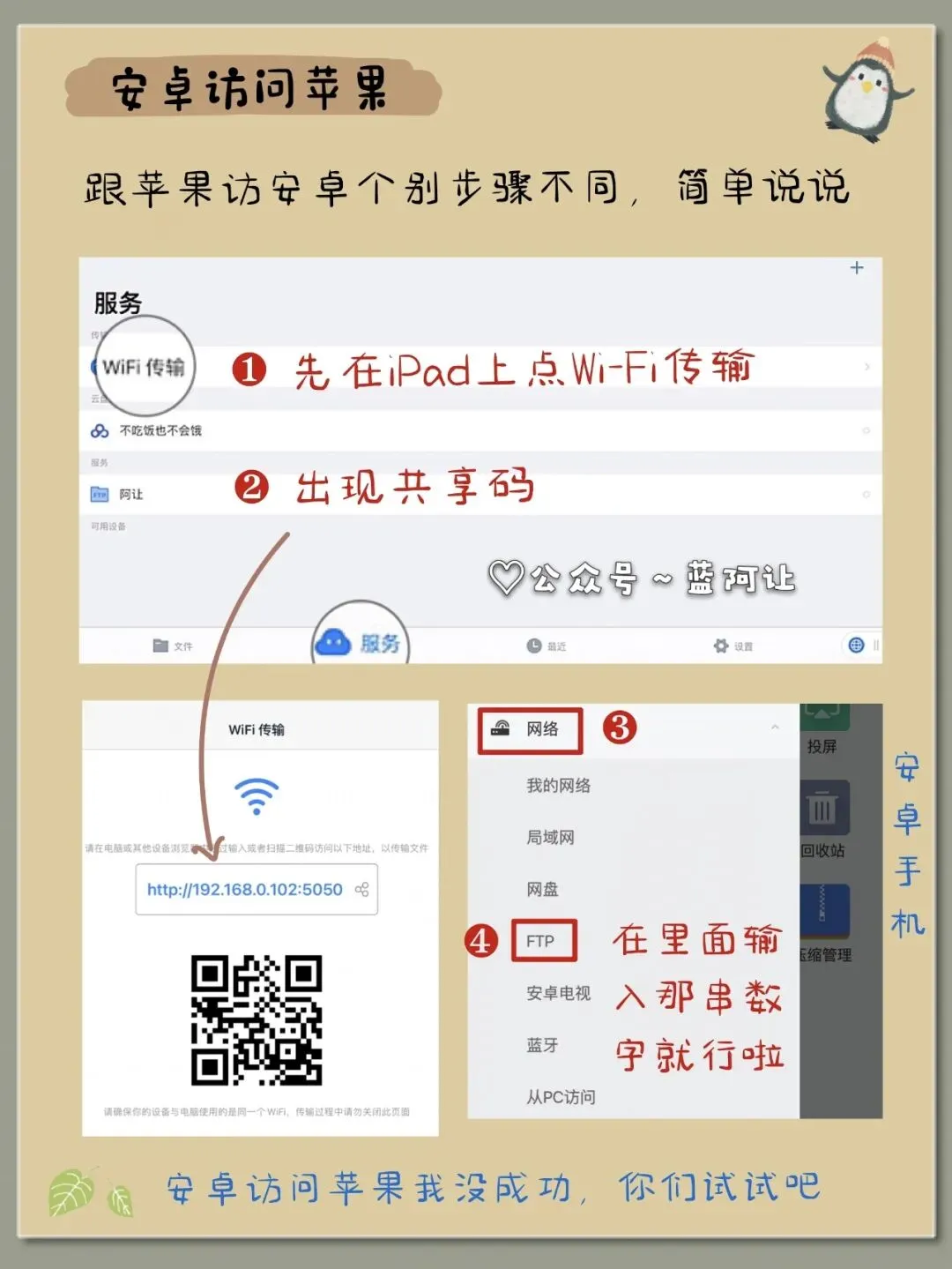 用“苹果访问安卓”的办法把安卓和苹果连上,在连着的情况下,直接把ipad里的文件转移到安卓的本地文件夹里