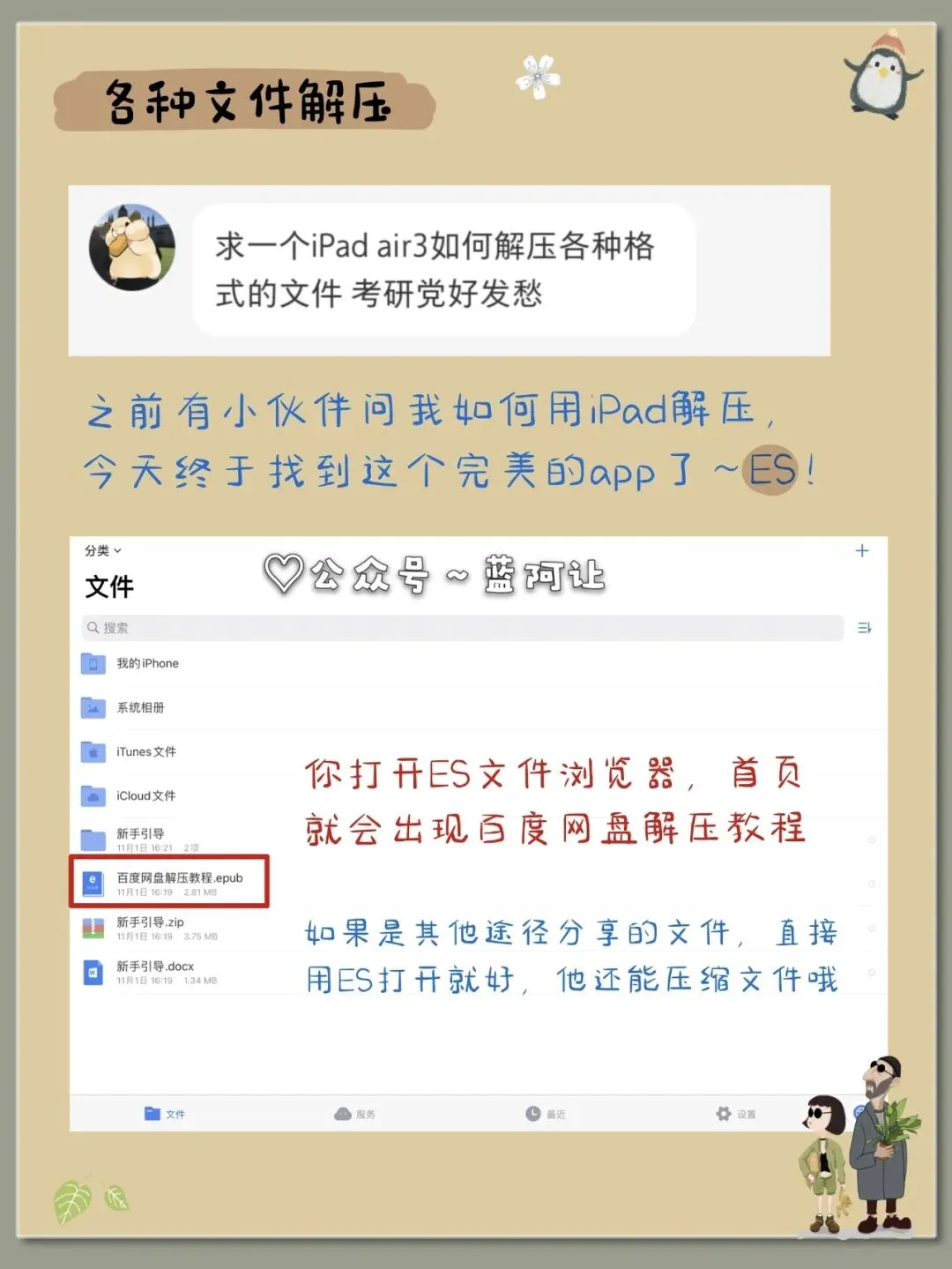 还有啊,前几天有个考研的妹子问我ipad解压各种文件的办法,ES就可以!除了本地的,百度网盘文件也可以直接在线解压,省了会员