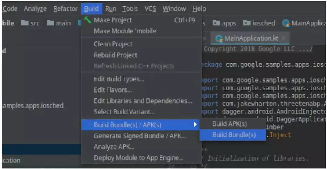 在 Android Studio 中打开项目后,转到菜单栏并选择 Build > Build Bundle(s)/ APKs > Build Bundle(s)。等待生成应用束。您可以在生成应用束后的弹出窗口中点击选项来找到生成的 .aab 文件,并进行分析。