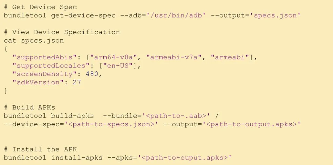 这是 bundletool 接受的所有命令:build-bundle,build-apks,extract-apks,get-device-spec,install-apks,validate 和 version。使用 bundletool help <command> 获取有关命令的详细信息,例如标识符和其他选项。