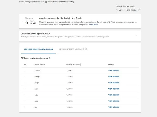 上传后,单击应用束并选择 Explore App Bundle 即可查询节省空间的大小。在这里,您可以搜索和下载针对特定设备的 APK。对于列出的配置,您可以选择 VIEW DEVICES 以查看将获得该特定 APK 的设备列表。