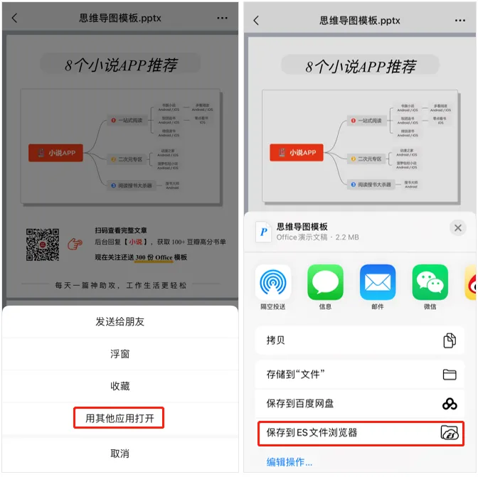 比如下面这份 PPT,我想保存的话,可以选择「用其他应用打开」-「保存到 ES 文件浏览器」👇