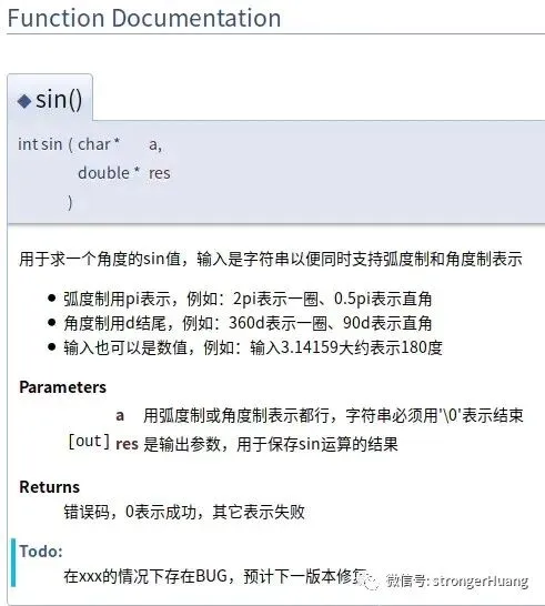 -- \file lmath.h--[[ 用于求一个角度的sin值,输入是字符串以便同时支持弧度制和角度制表示 \li 弧度制用pi表示,例如:2pi表示一圈、0.5pi表示直角 \li 角度制用d结尾,例如:360d表示一圈、90d表示直角 \li 输入也可以是数值,例如:输入3.14159大约表示180度 \param a 字符串类型,表示角度,用弧度制或角度制表示都行 \return 返回sin运算的结果 \todo 在xxx的情况下存在BUG,预计下一版本修复--]]function sin(a) return 1.123end
