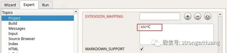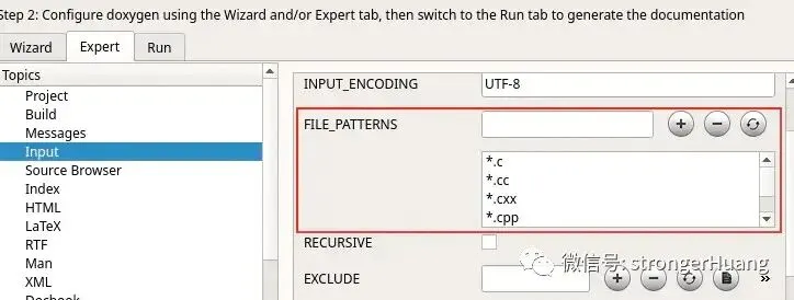 如果我们的扩展名并不在FILE_PATTERNS内,那么可以加上去。例如我们项目下的所有.ccc文件,其实是C语言代码(这很奇葩,举个例子而已)。那我们可以编辑Doxyfile配置文件满足这一需求,需要2个步骤。