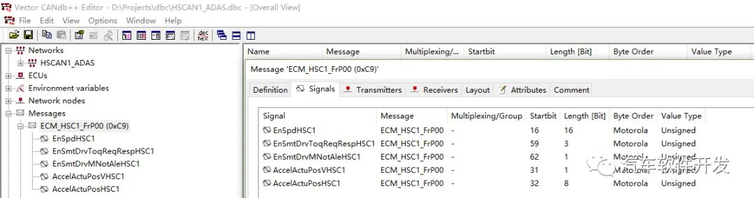 左侧树状图中Messages下有很多message(报文),每个报文下又有一些signal(信号)。报文名称后的括号内就是这个报文的ID。右侧为每个信号的一些具体信息,比如起始位,结束位,字节序,参数类型等。