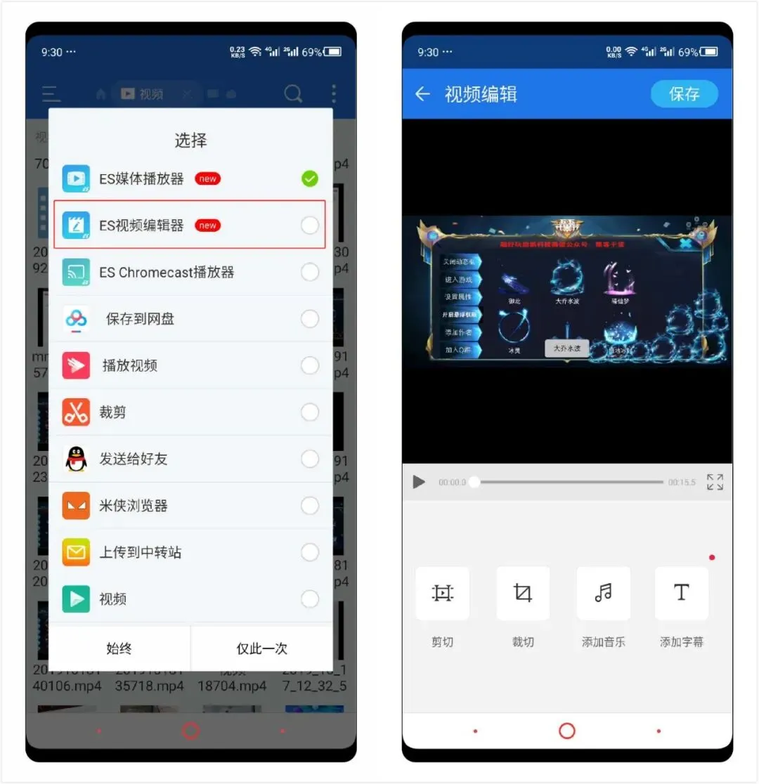 ES文件管理器可直接对手机里的视频进行编辑,裁剪、剪切、添加音乐、添加字幕、调整倍速、画中画添加图片、添加背景…