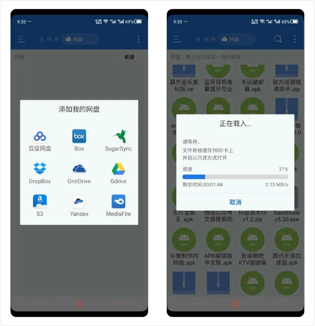 ES文件管理器还支持登录多种网盘账号,比如百度网盘、Box、Yandex等,经测试登录后可直接下载百度网盘里的文件,比官方的百度网盘下载快,部分文件还不限速;