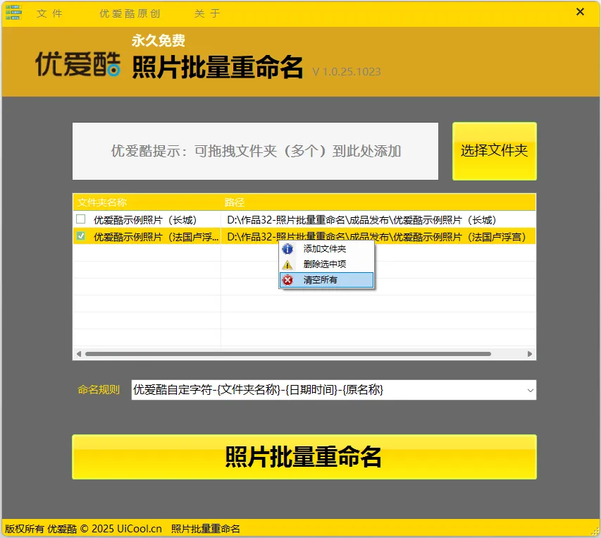 这款优爱酷优爱酷批量照片重命名工具,没有花里胡哨的功能,直接解决 “批量重命名” 这个核心需求。不管你是需要整理家庭相册的普通人,还是经常处理大量图片素材的办公族,它都能帮你省去超多麻烦。