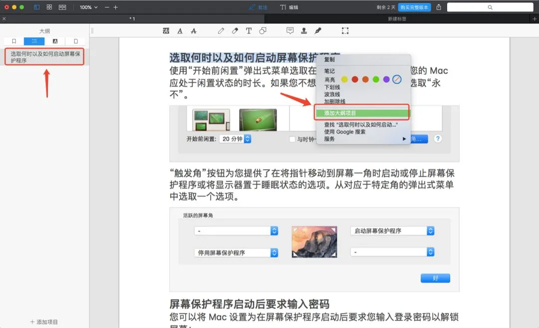 值得一提的是批注功能中包含的添加大纲项目功能。批注模式下,在任意文本上右键,选择「添加大纲项目」,即可将其加入到左侧的大纲,而且拖动大纲中的标题(目标位置)即可随意转换包含关系,点击标题可跳转至对应段落。
