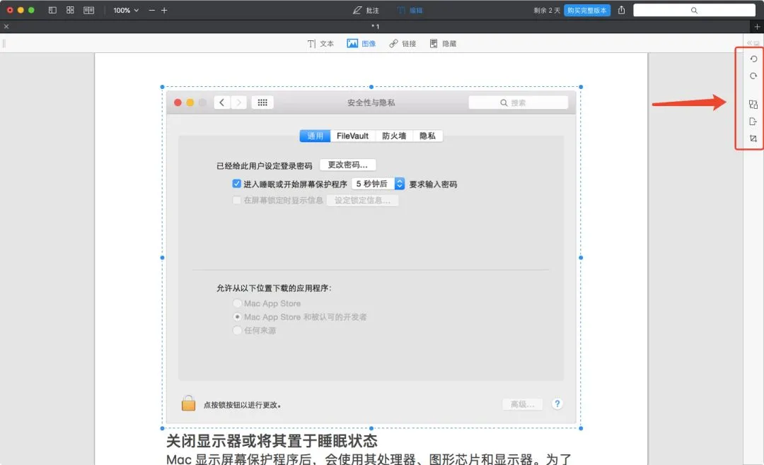 编辑图像操作方法与编辑文本同理,在编辑模式下,点击页面顶部的「图像」按钮,然后选择文档中的图片,右侧工具栏将提供旋转、替换、导出、裁剪选项。