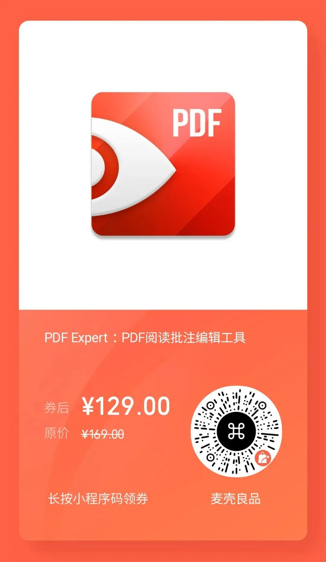 PDF Expert 原价 169 元,现在「麦壳良品」正在搞优惠活动,领券下单立减 40 元,到手价只需 129 元,活动时间:即日起至 2021 年 3 月 15 日 24 点。长按下方图片即可领券购买。