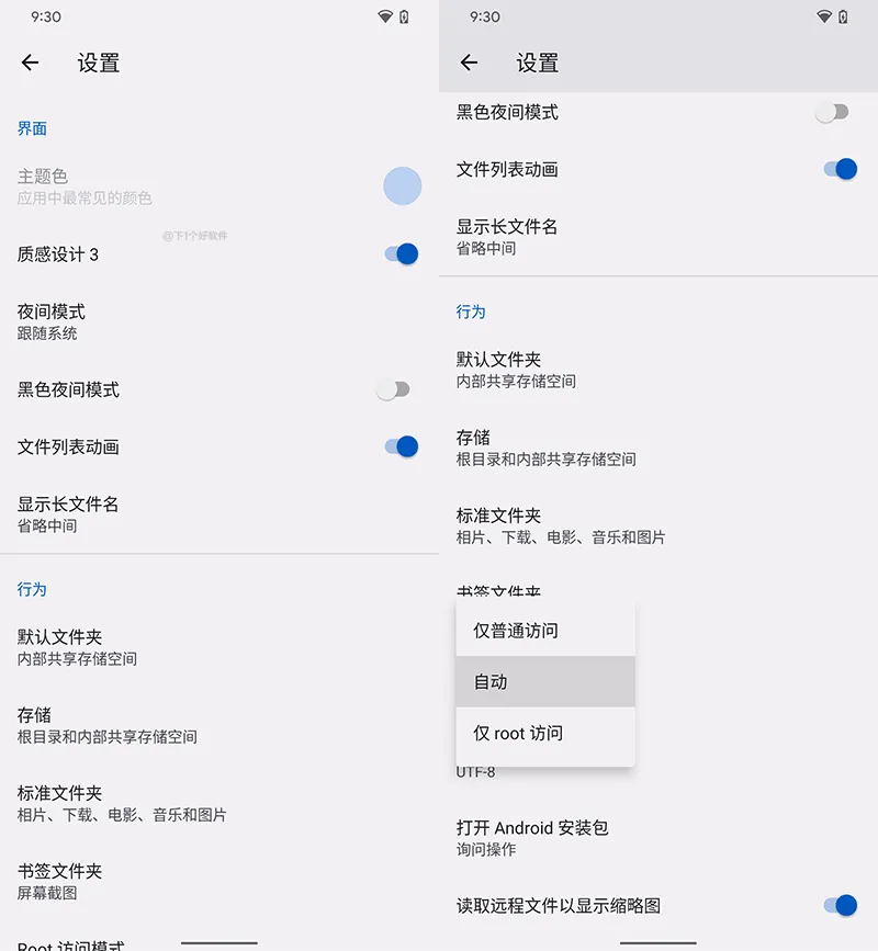其它功能设置方面,支持界面颜色、文件列表动画、默认文件夹、书签文件夹、以及可以设置 ROOT 访问模式哦。