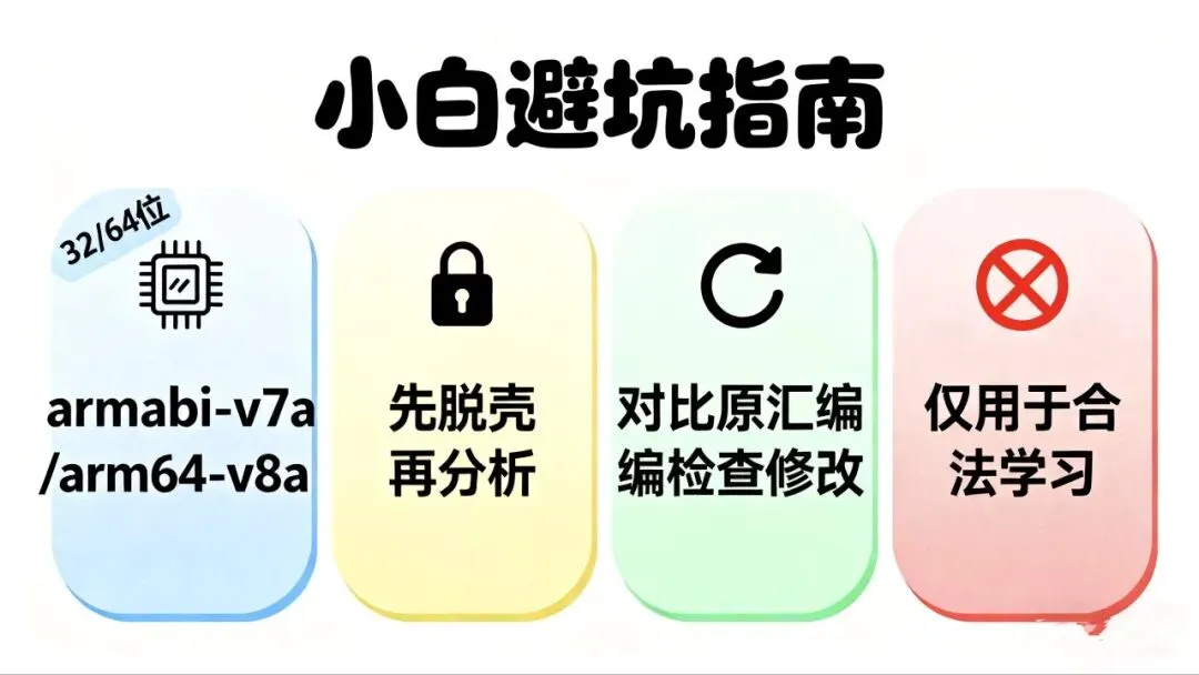 2. 遇到加固的SO怎么办:如果APK加了360加固、梆梆加固,SO文件是被加密的,得先脱壳!脱壳后才能拿到真实的SO文件(脱壳可以用 FDex2 、 Frida 这些工具,新手先学简单脱壳);