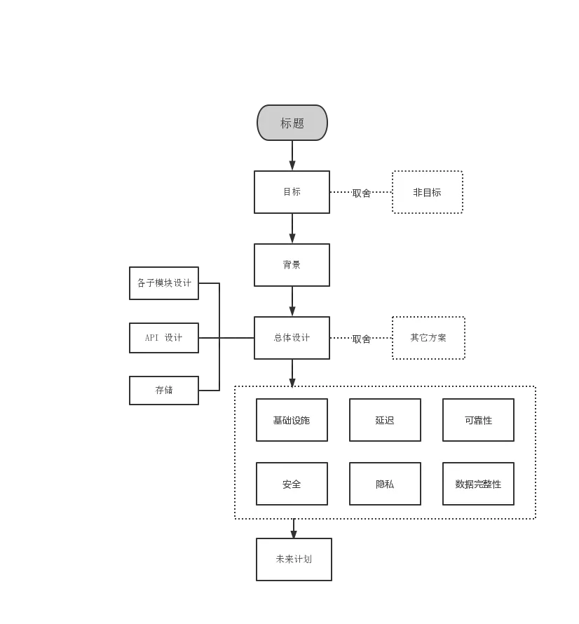 在介绍了最终方案后,可以有一节介绍一下设计过程中考虑过的其他设计方案(Alternatives Considered)、它们各自的优缺点和权衡点、以及导致选择最终方案的原因等。通常,有经验的读者(尤其是方案的审阅者)会很自然地想到一些其他设计方案,如果这里的介绍描述了没有选择这些方案的原因,就避免读者带着疑问看完整个设计再来询问作者。这一节可以体现设计的严谨性和全面性。