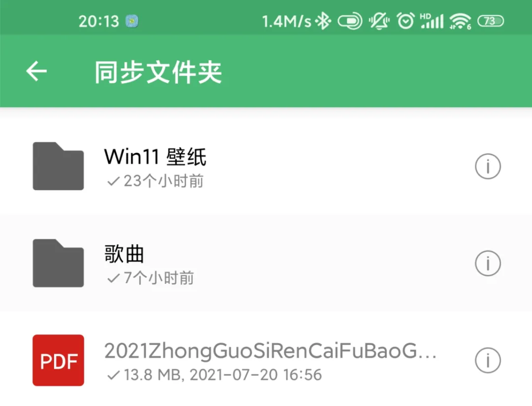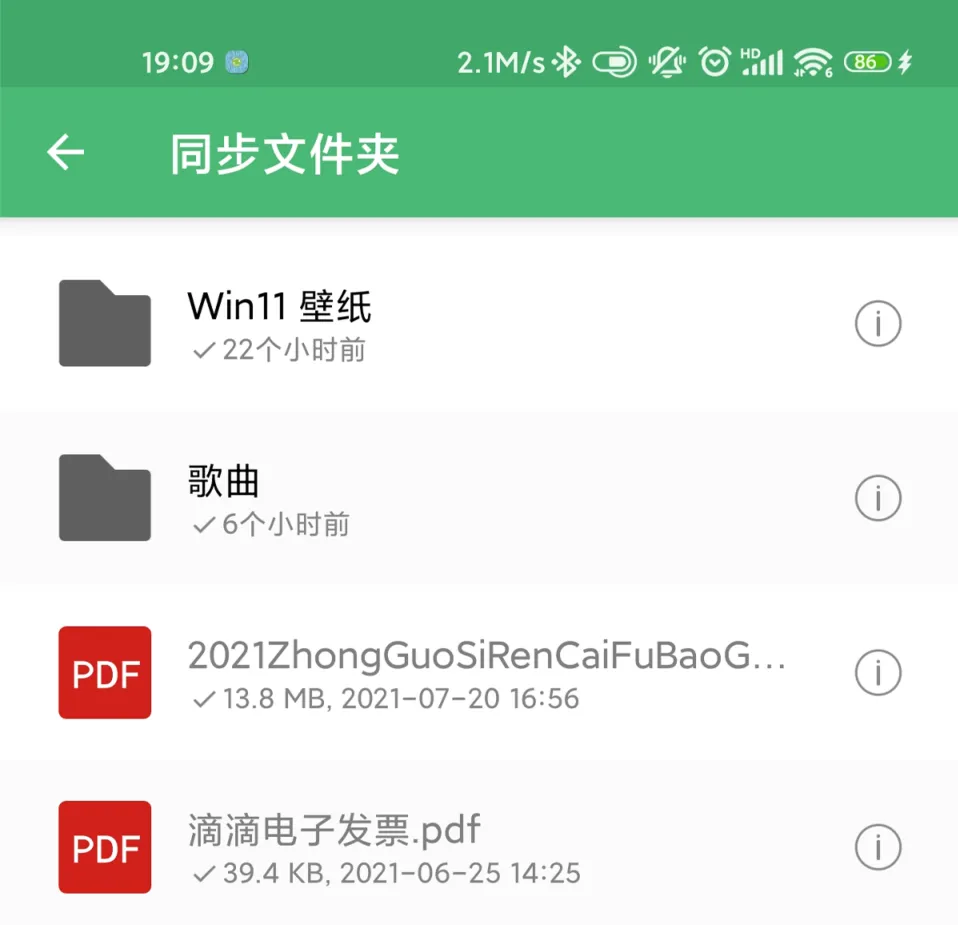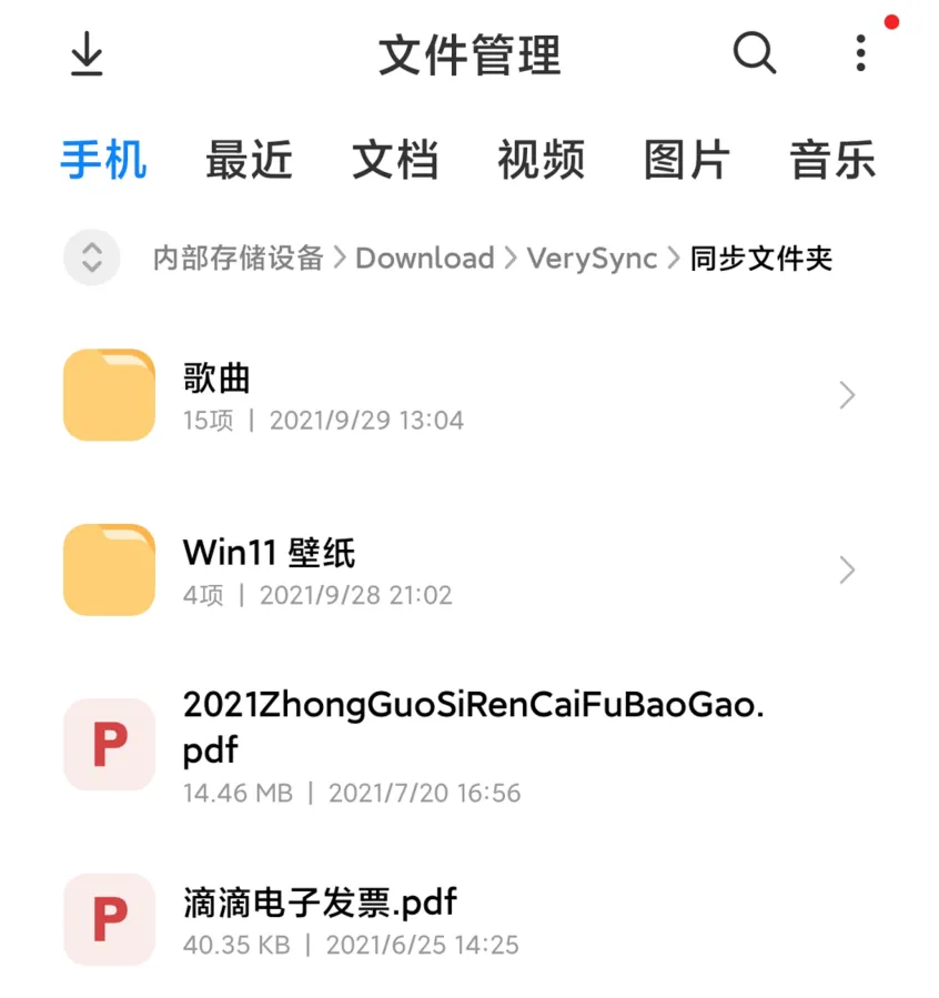 先打开我安卓手机上的微力同步 App,各位差友可以看到前面 Windows 电脑 “ 同步文件夹 ” 里的文件已经被这软件同步在手机里了: