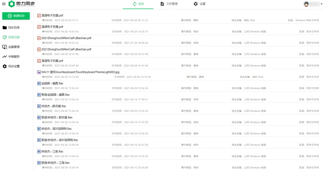 在电脑端微力同步操作界面,你可以直接查看这些文件的修改记录,并且清楚地知道这些文件是在哪台设备上被修改的、它们的修改时间是什么时候: