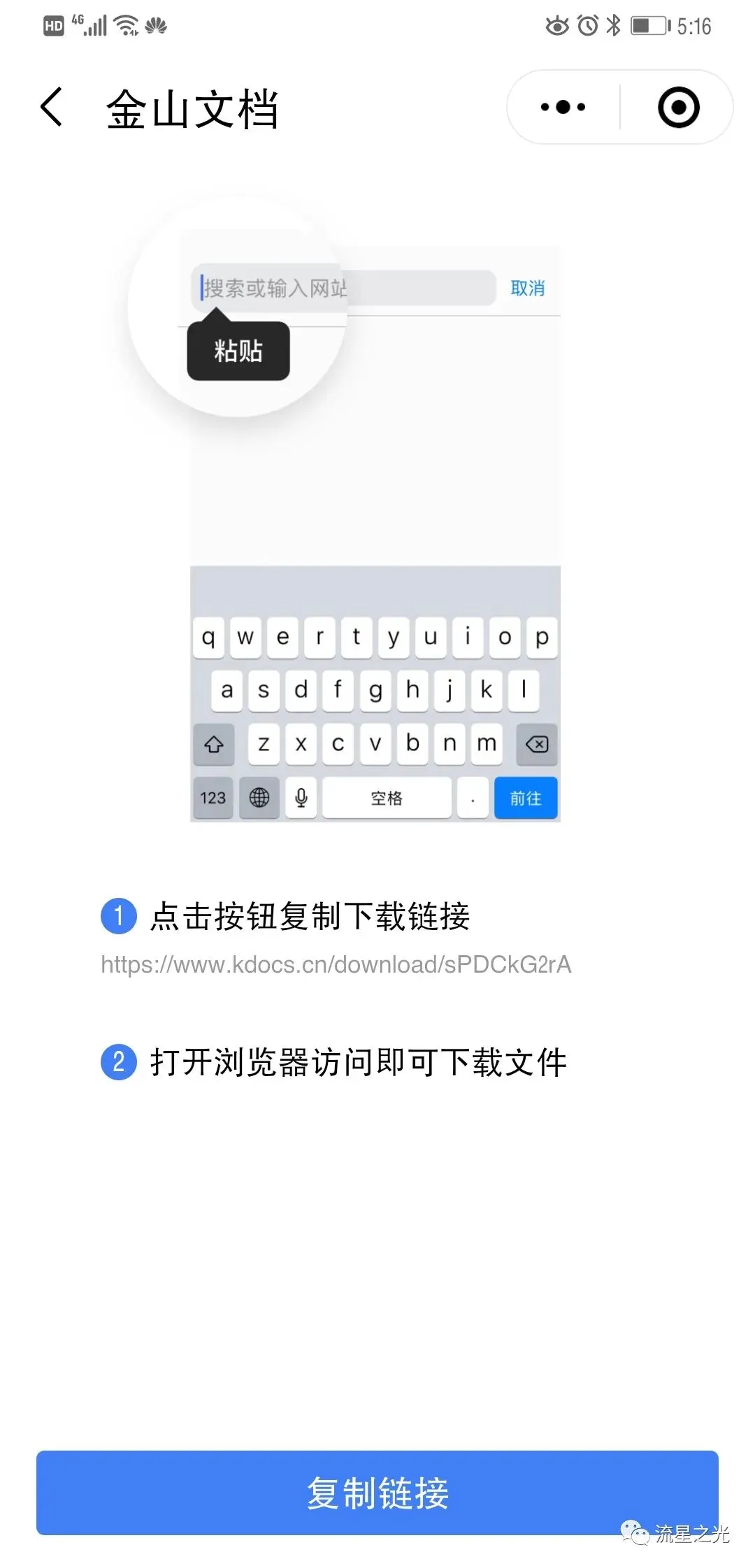 点击“复制链接”按钮,然后再打开一个浏览器,把链接粘贴进地址栏就可以下载文档了。