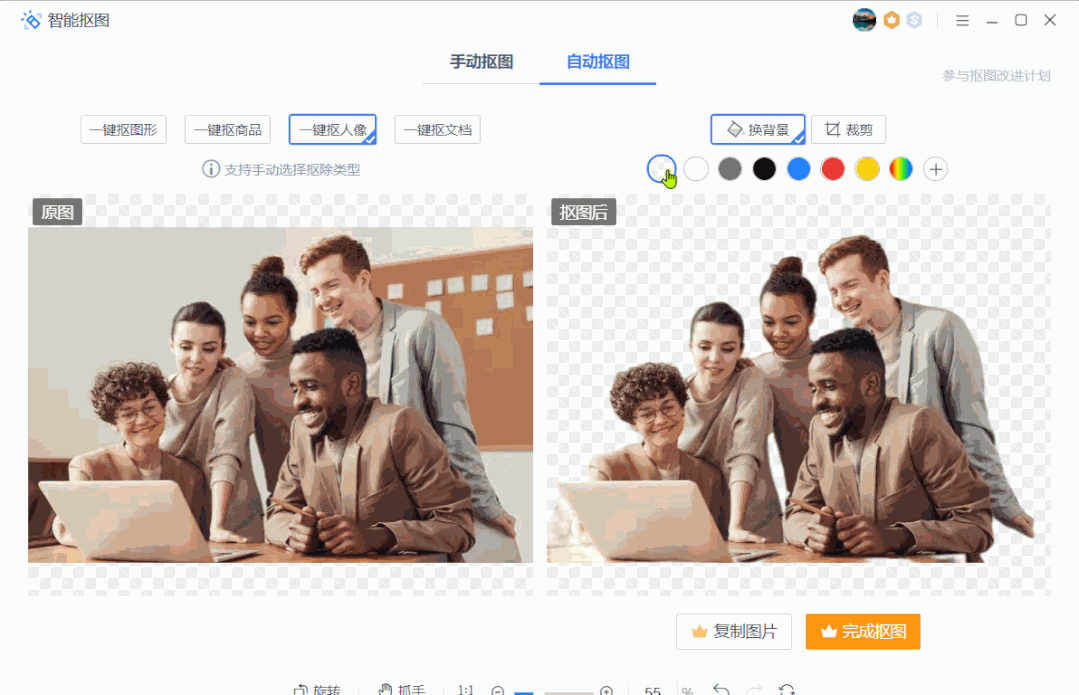 1.选中图片,在【图片工具】选项栏中找到【扣除背景】,直接点击,进入【智能抠图】模式,系统自动定位到一键抠人像,稍稍等待,图片里的人像就被完整抠出。