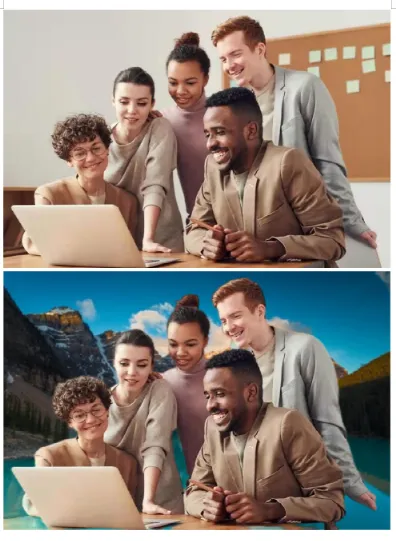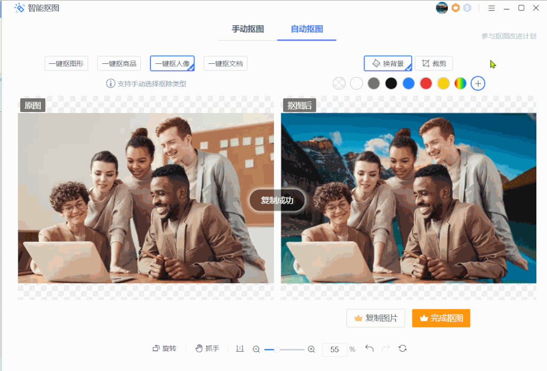 2.选择【换背景】,可以看到有透明背景、纯色背景、渐变背景等各种类型。这里为了满足领导的诉求,我们点击最后的“+”,给这个图片添加一个山水风景背景,瞬间一种徜徉于山水之间,还不忘努力工作的和谐感扑面而来。