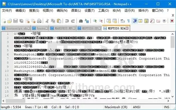 这个文件夹下的RSA格式的文件是开发者对该应用程序进行签名的签名证书文件,玩过塞班系统的同学应该对这个词并不陌生,这也是为了保证应用程序和系统的安全,签名文件不是纯文本格式,不过当我们用文本编辑器打开它时,可以在乱码中零散地看到Microsoft Corporation字样。
