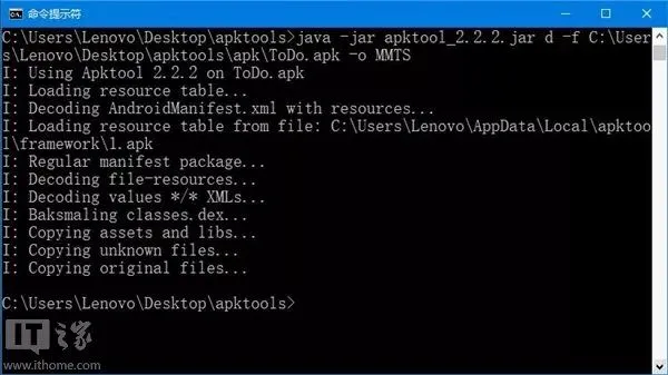 java -jar apktool_2.0.1.jar d -f C:\Users\Lenovo\Desktop\apktools\apk\todo.apk -o MMTS