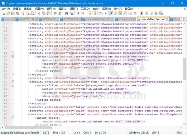 是的,安卓应用安装包里的很多文件中的内容我们是不能直接看到的,比如Microsoft To-Do应用,它里面的xml文件和dex文件用文本编辑器打开以后显示的是乱码,如果你想愉快地看到这些文件的真身,那就需要对它的安装包进行反编译。