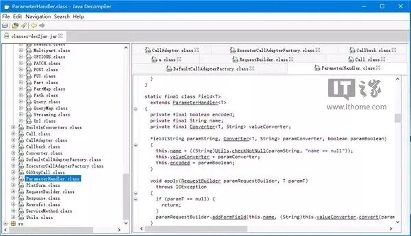 依次点击File-Open file,选择我们刚刚得到的classes-dex2jar.jar,打开它,你就能看到应用程序的JAVA源代码了。