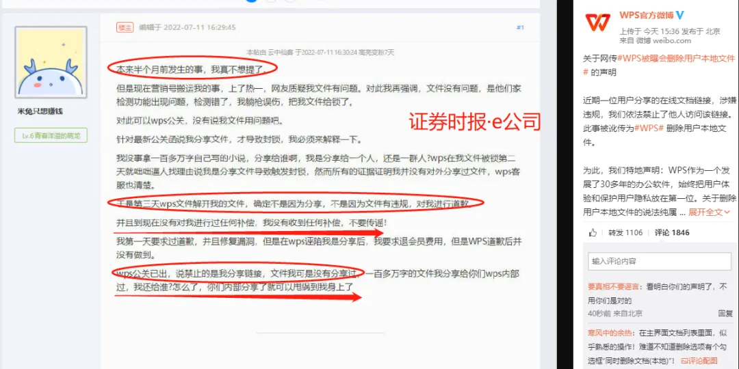 进一步来看,2022年6月25日“米兔只想赚钱”发帖表示,“躲过码字软件吞稿,躲不过WPS窥稿,并自行封锁稿子,严禁访问。”该网友称,自己的文件不涉黄、不涉政,且是本地文件,没有对外分享甚至贩卖。因此,该网友质疑,未更新内容被WPS内部人员擅自偷窥。