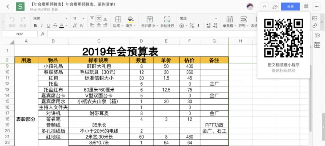 在具体操作区域,WPS文档的上方显示了基本的在线文档功能区,左上角是在线协作文档的名称、更新时间和最新修改者,右侧是个人中心“我”、协作记录、分享、二维码(可把文档装进小程序)、文档打开下载保存版本等处理,看起来简单易懂。