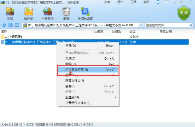 将需要打开的高版本PR工程文件后缀名更改为【.zip】,也就是更改为压缩包。这是一种常见的简易更改程序内部代码的方式,大家可以多了解一下哈。
