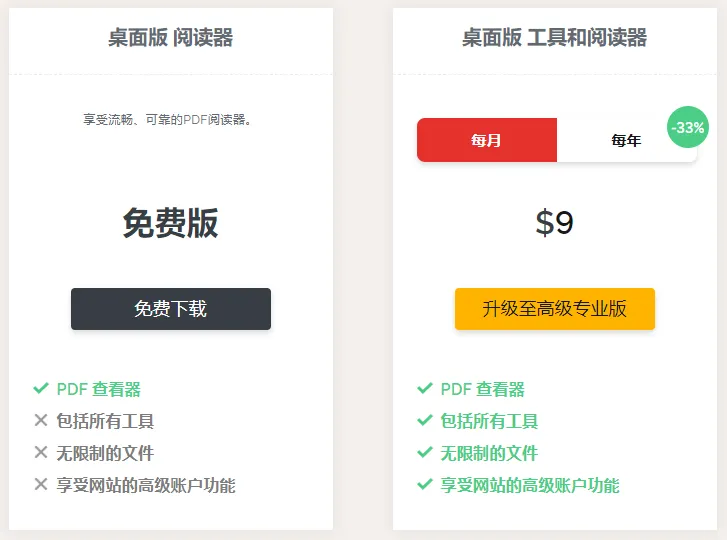 iLovePDF也是一样,他们也有桌面版和移动版的产品。桌面版的iLovePDF,免费版只有PDF文档阅读的功能,要使用其他的工具的话,就要付费了,每月9美元的价格也是不便宜了。