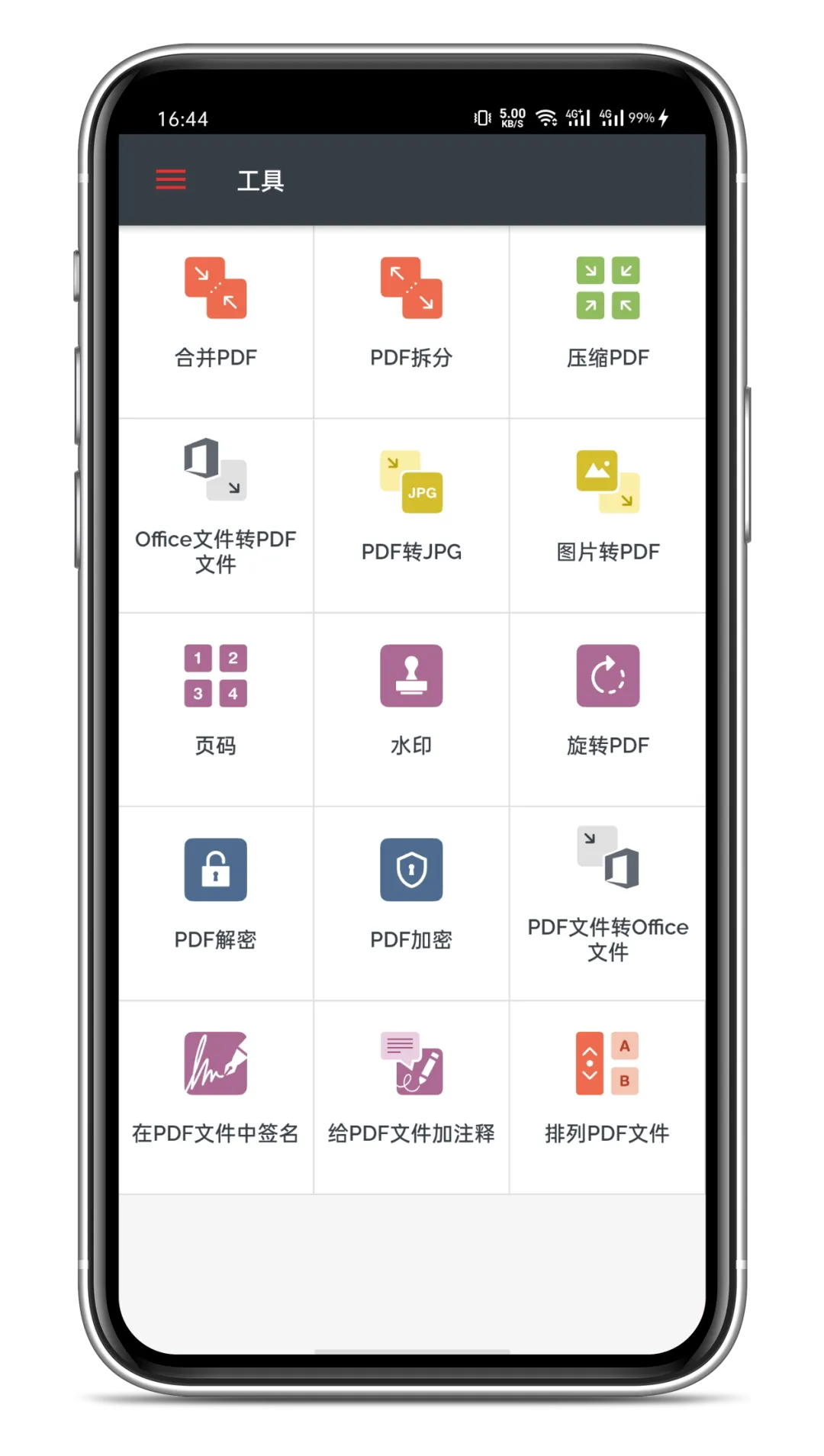 iLovePDF移动版基本上是把我们上面介绍的网页版的工具整合进APP中,通过手机来使用这些功能。