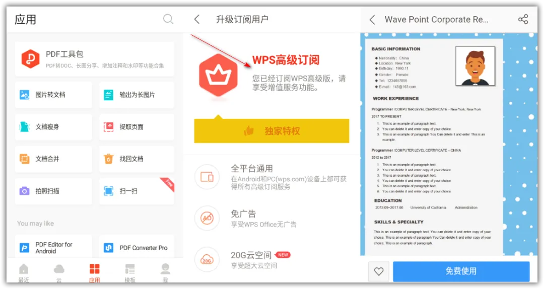 免广告,所有的高级功能及在线模板免费使用;