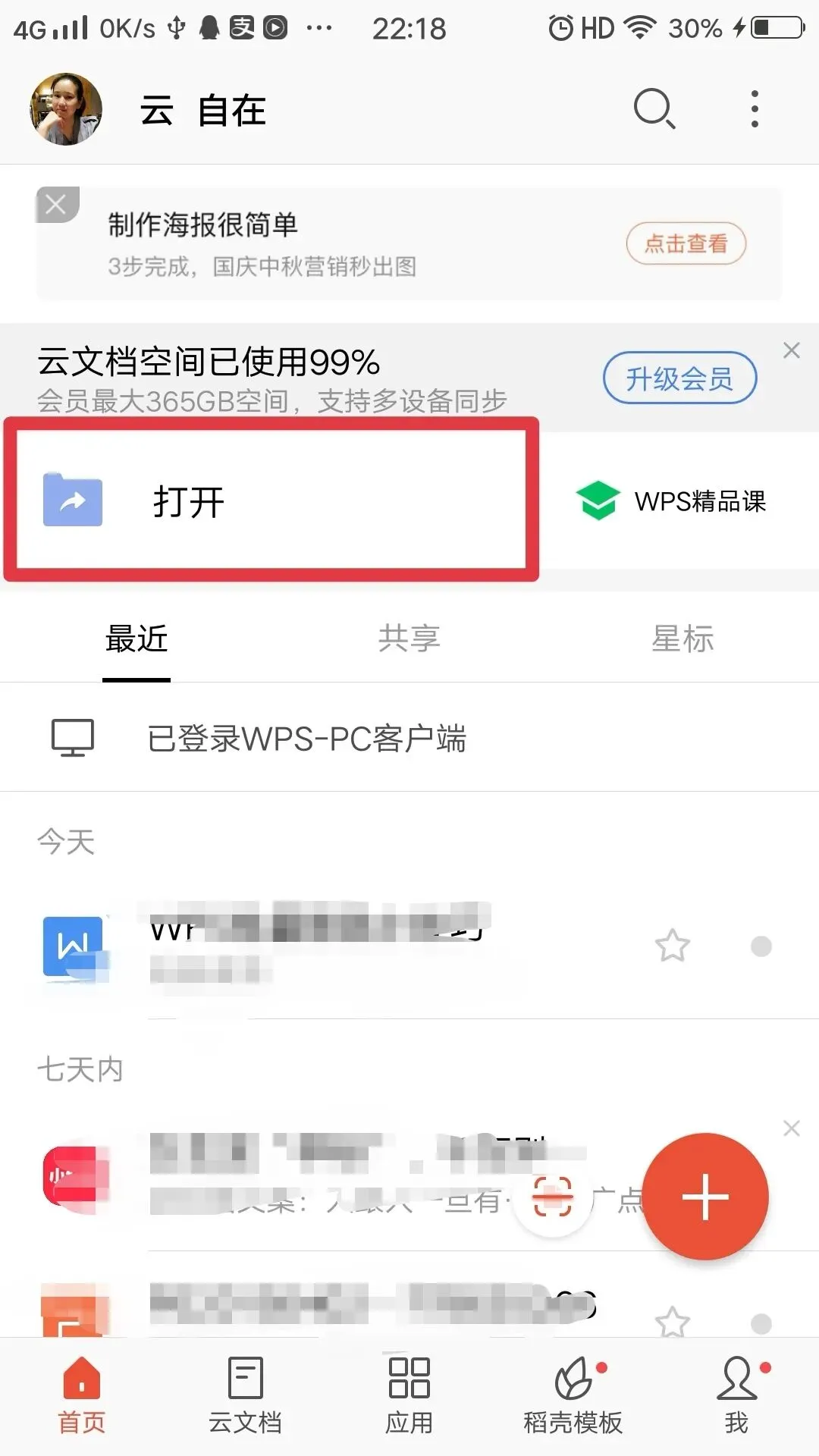 1.打开WPS,在首页【最近】界面选择【打开】。
