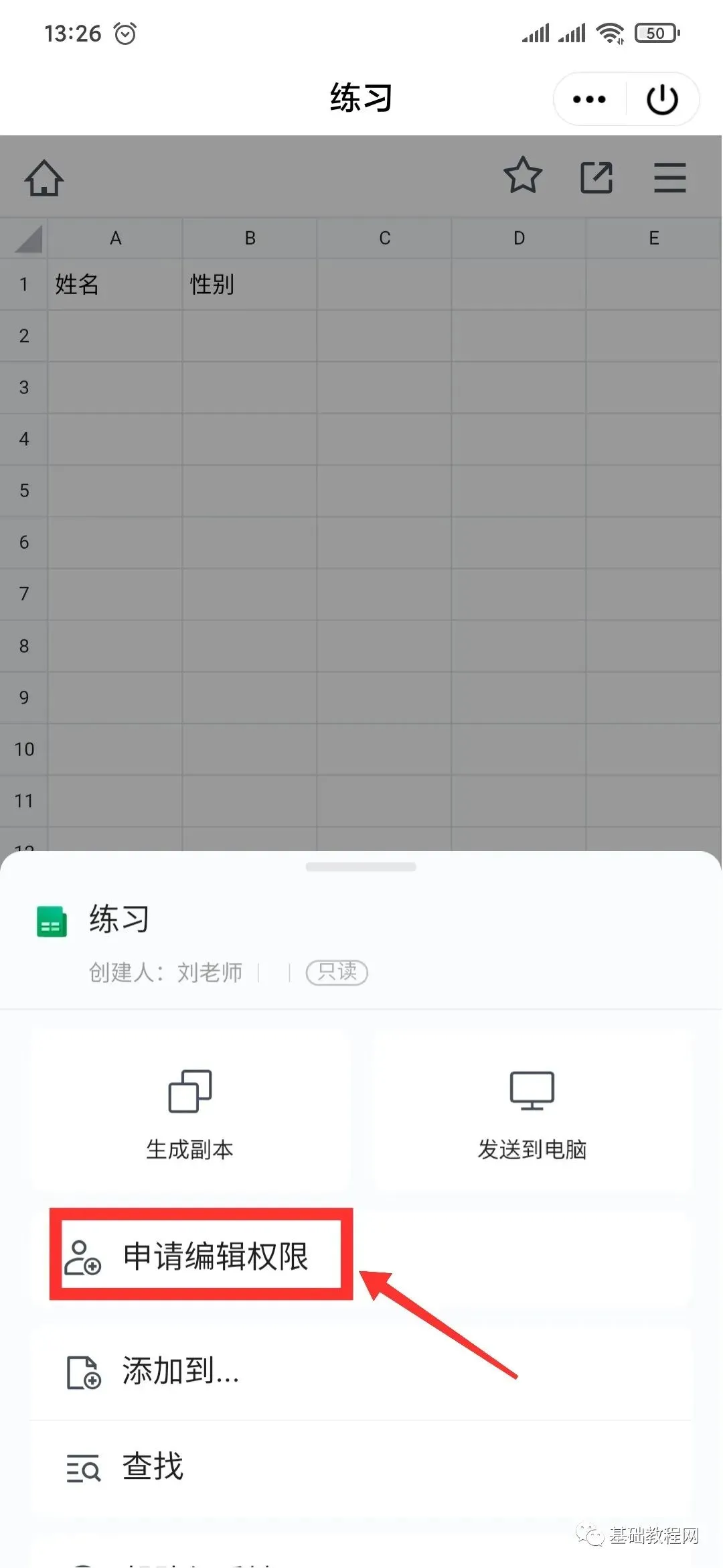 2、在下边弹出的面板理选择“申请编辑权限”;