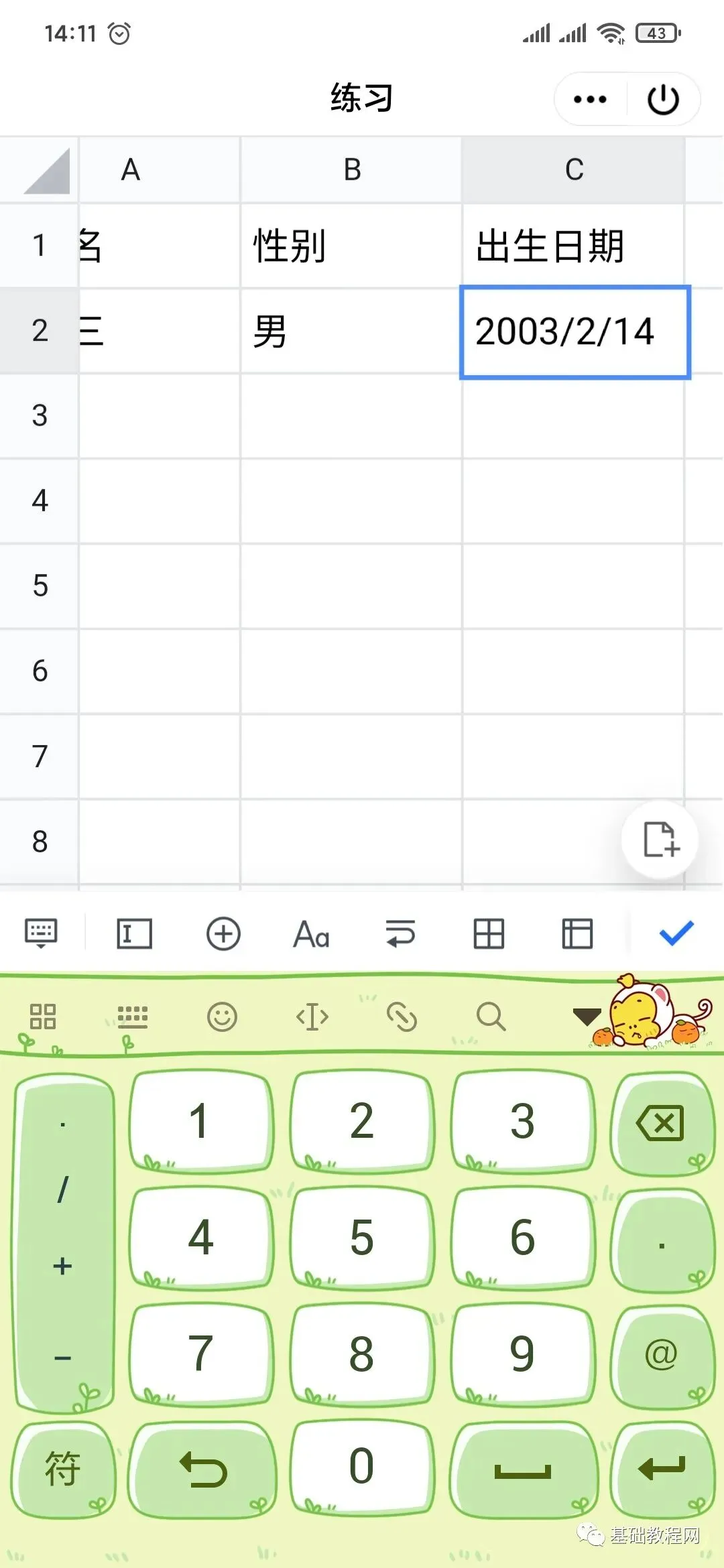 12、继续输入性别“男”,日期年月日之间用英文斜杠分隔,在数字输入里可以找到;