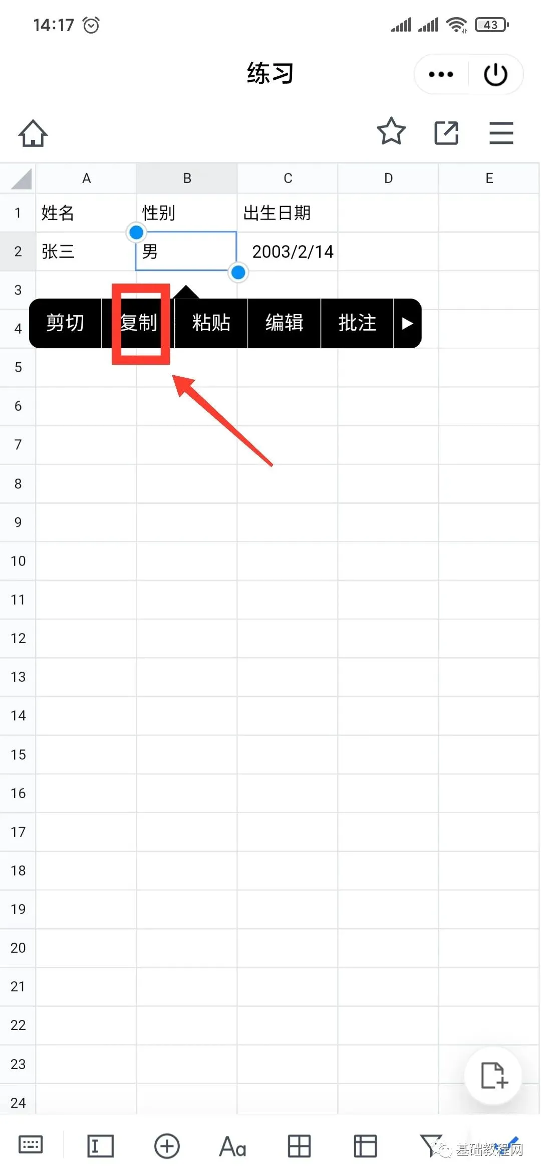 14、同样,复制粘贴也是先选中一个单元格,再次点击一下,在弹出的菜单选“复制”,然后在另一个格子上点一下,选“粘贴”;