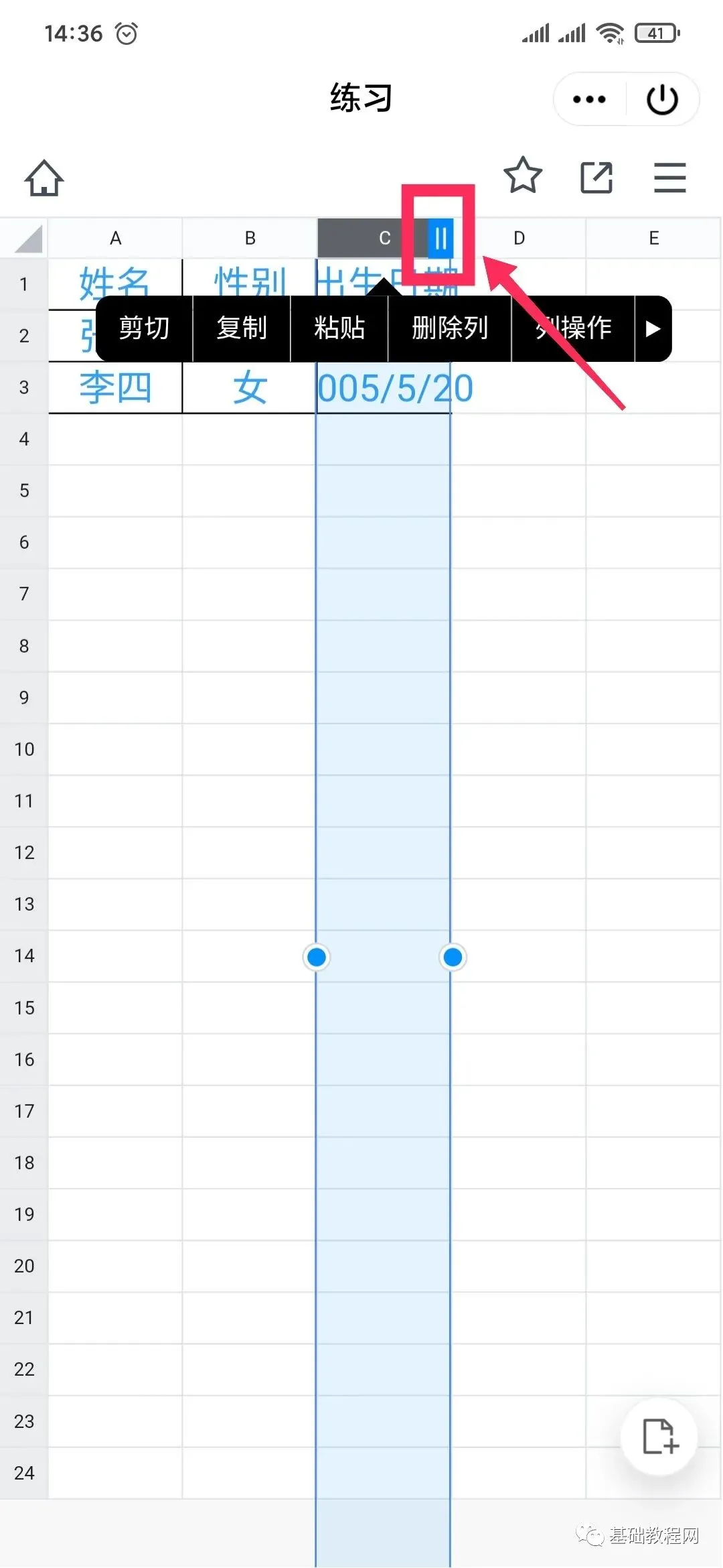 19、C列格子不够宽,瞄准标题C,点击选中C列,不用管弹出菜单,找到列边距两条竖线;
