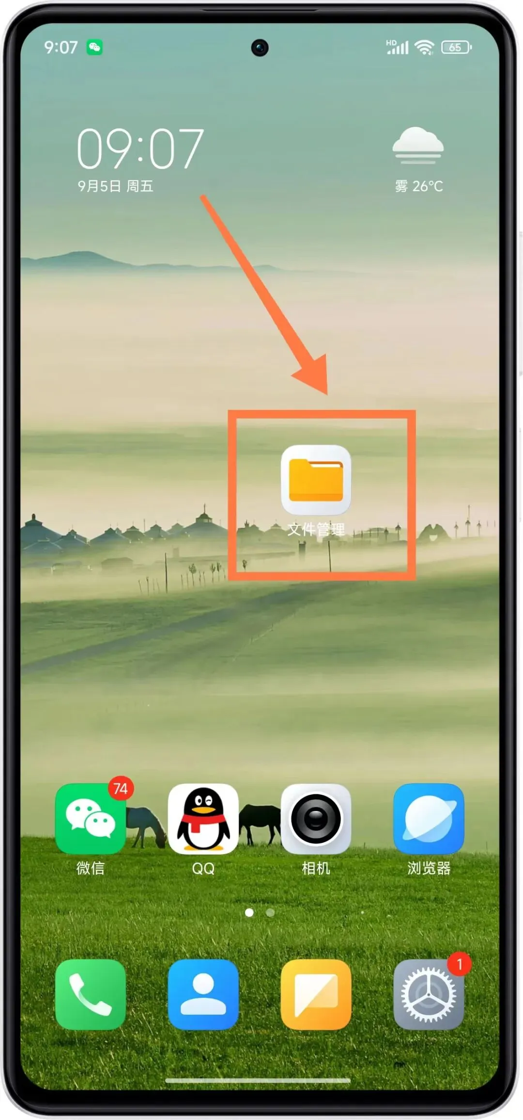 第一步:一般情况下文件管理图标,都会在手机桌面上显示,是一个文件夹图标,如果找不到可以在系统工具文件中查找。