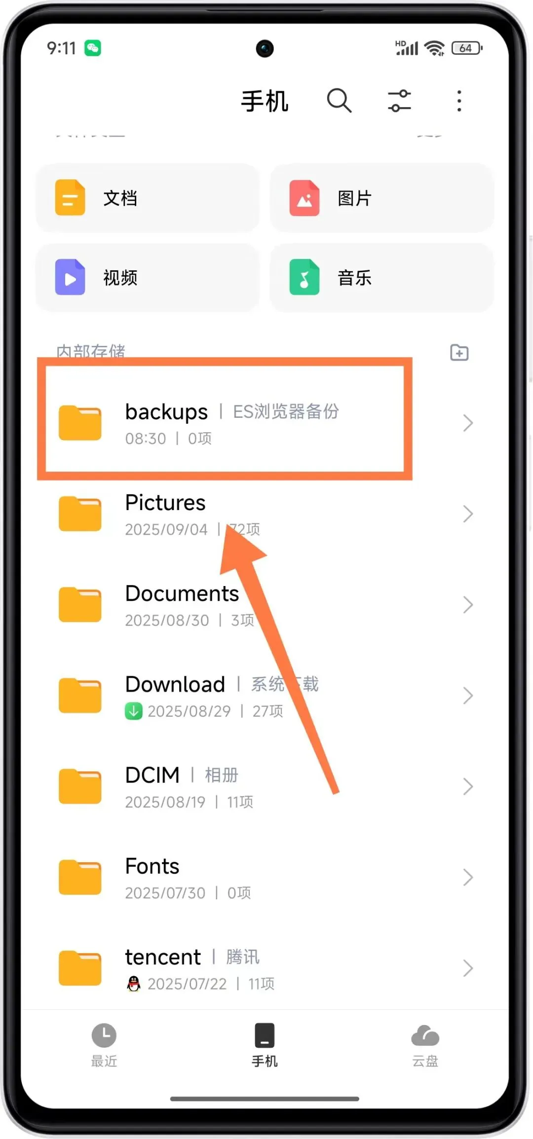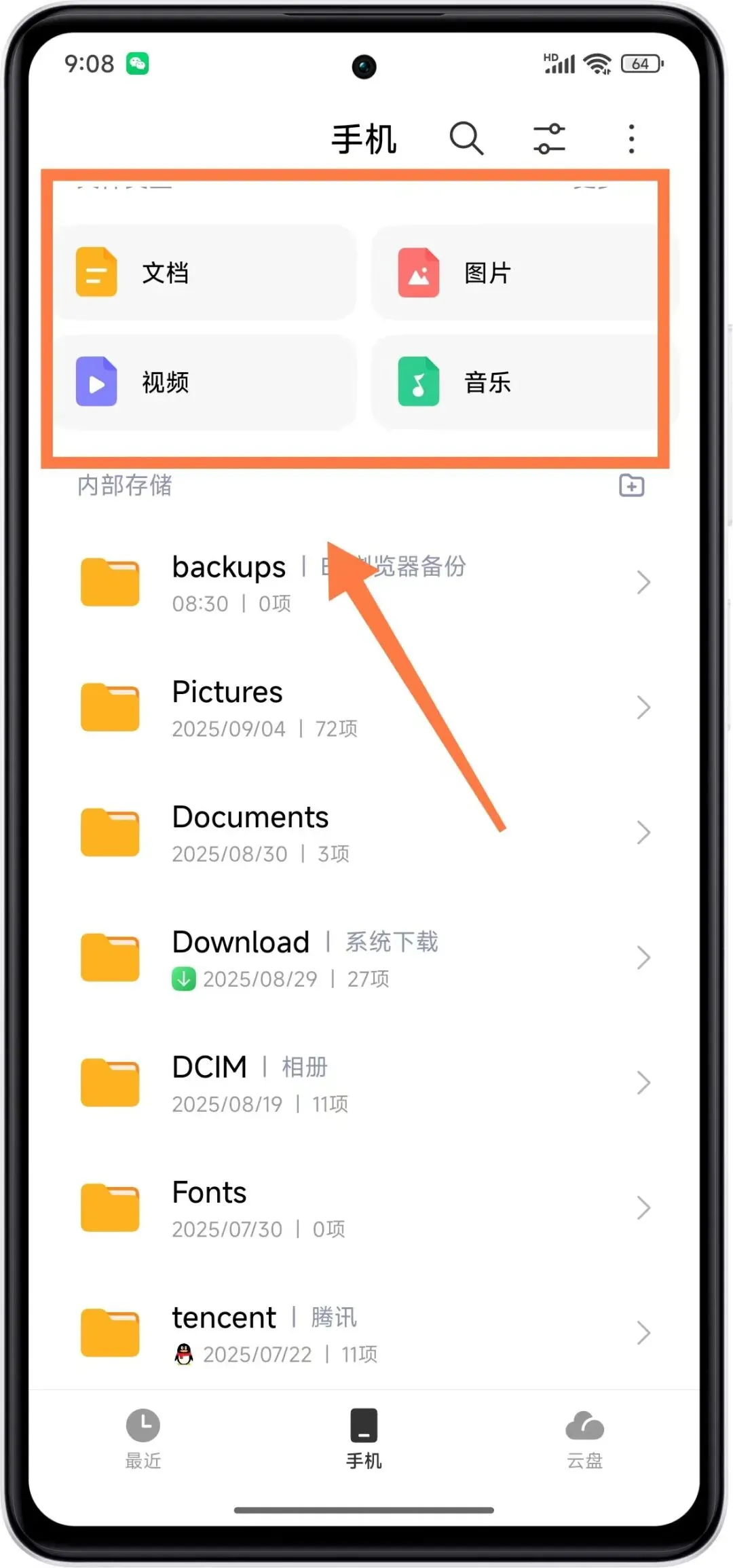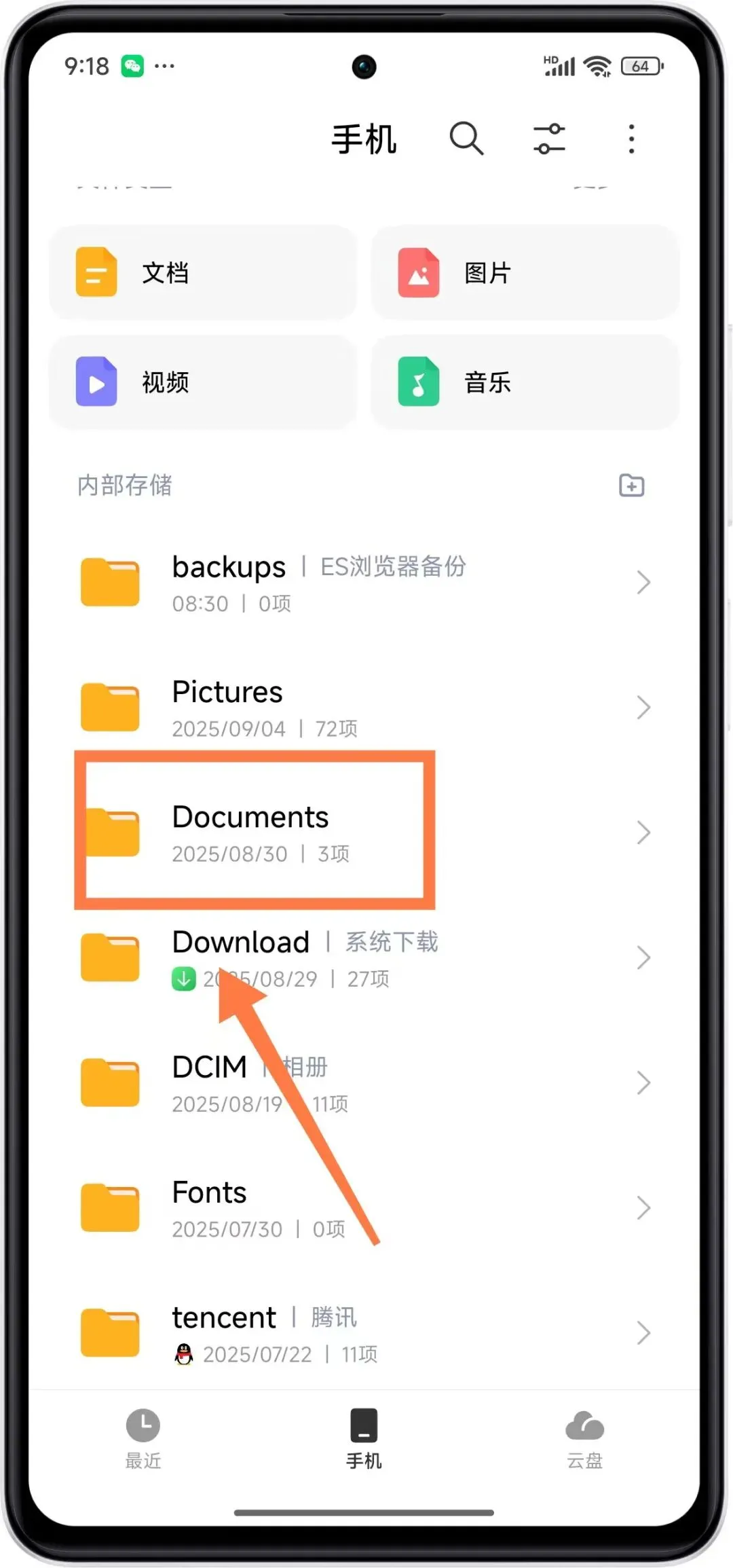 第二步:进入到手机的文件管理页面后,我们就可以看到文件类型比如【文档】、【图片】、【视频】、【音乐】,以及下面的一些文件夹。