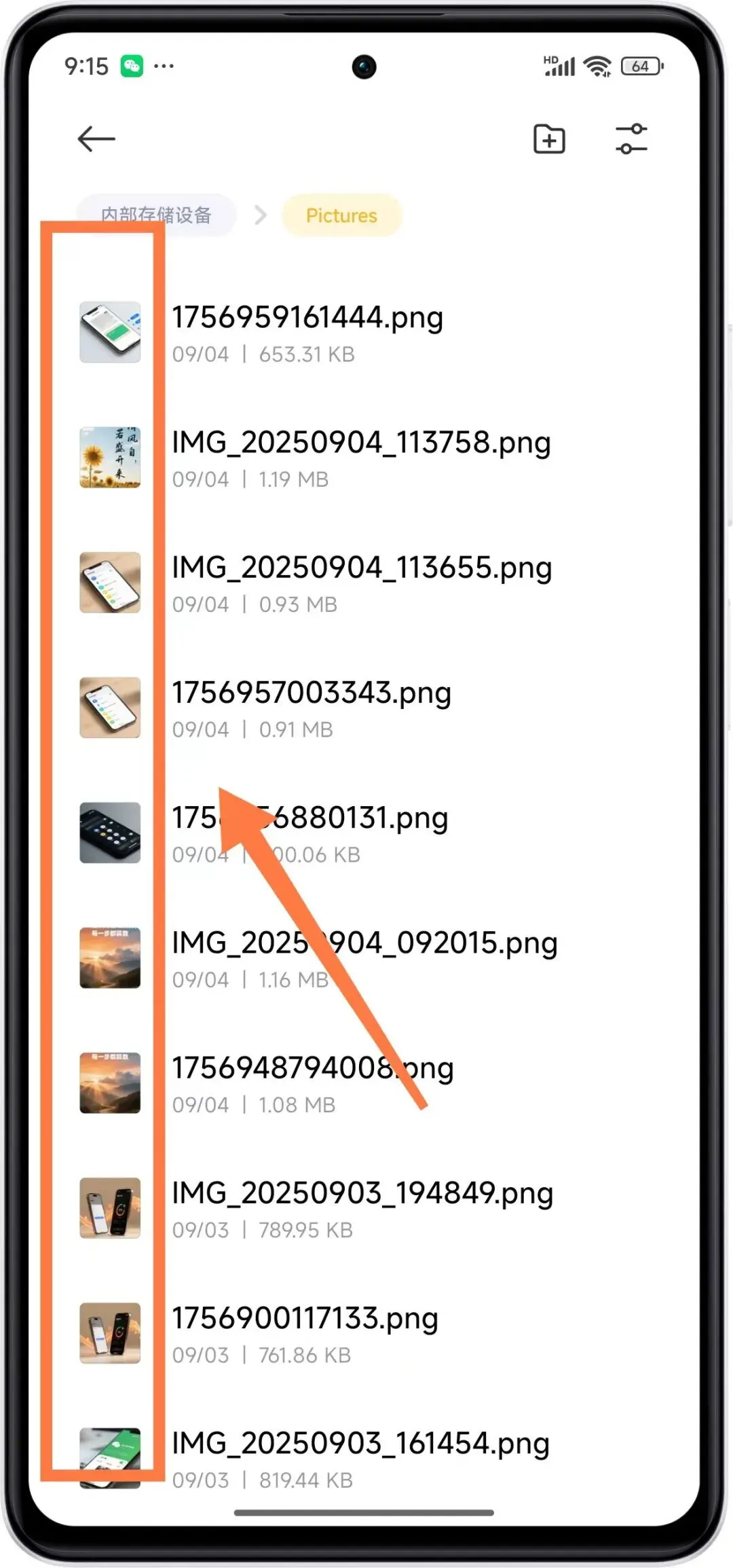 并且我们向下滑动页面,也可以看到平时保存的一些截图也是存放在这个文件夹里面的。因此Pictures文件夹建议谨慎删除,如果里面的图片我们用不到,可以单个进行删除。