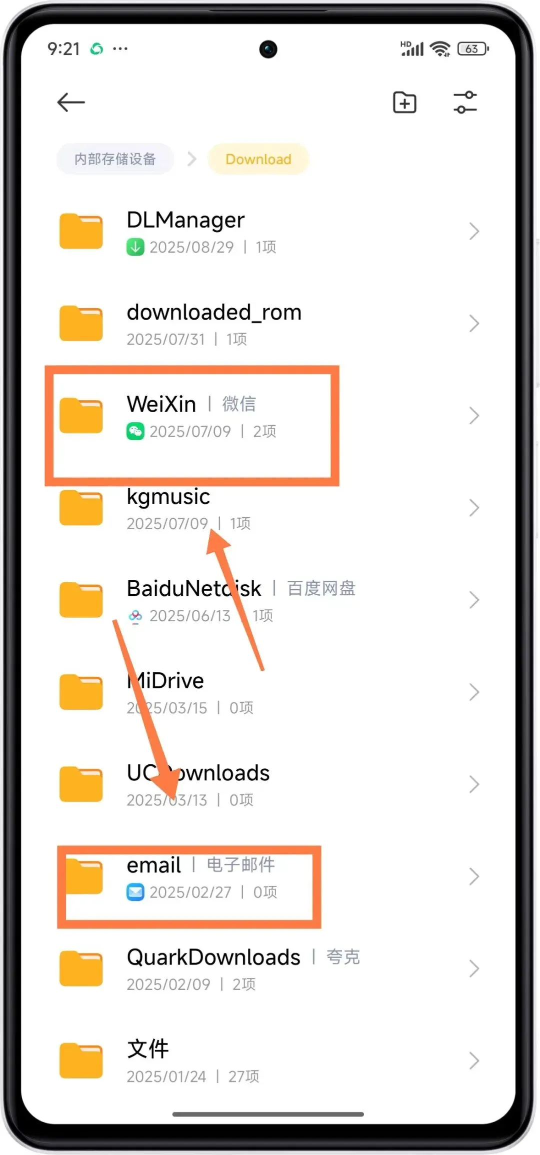 Download文件夹:系统下载的文件都会存放在这个文件夹中,打开以后,我们可以看到微信接收的文件会保存在这个文件夹,电子邮件接收到的附件也会保存在这个文件夹,以及我们平时下载的一些文件也都会保存在这个文件夹。