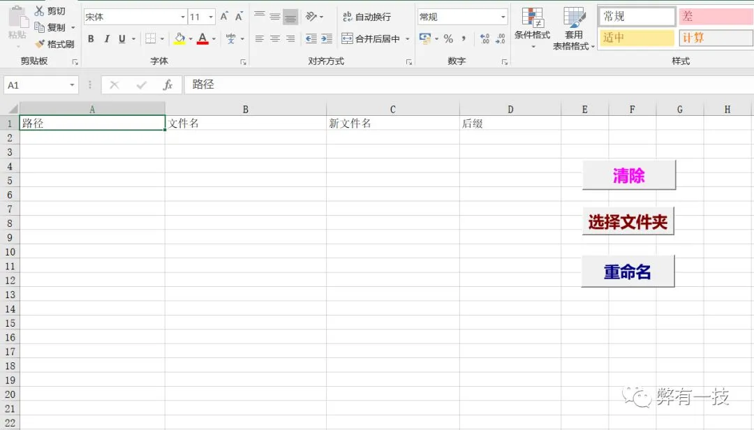 如下,今天分享的并非软件,而是简单的一个Excel表格,表格运用的函数及宏,刚开始使用会提示是否进行编辑,选择是,即可正常使用,主界面如下,干干净净的,只有选择文件夹和重命名两个功能,就是如此专一。