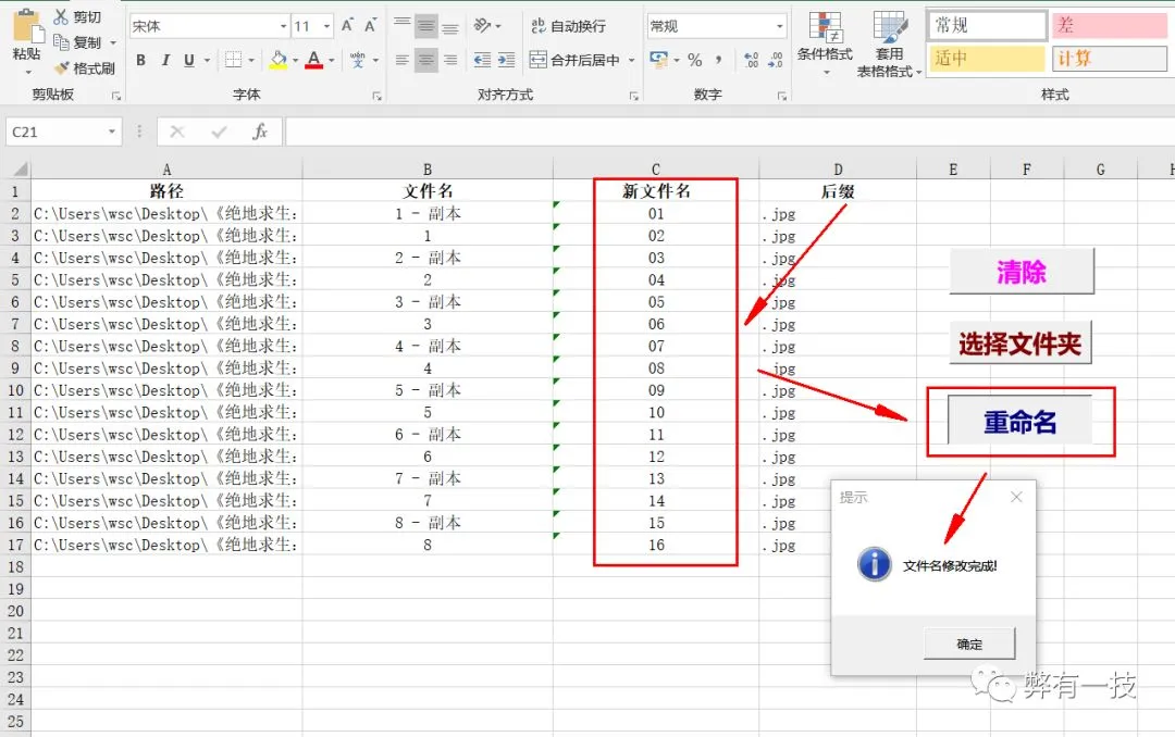 简单的办公文档,相信大家都会耍,但是大部分都只是入门级别,若是深入,还不知道能研究多深,特别是这Excel文档,有人还能作画,而PPT也是,简单的几个页面或许就加入了上千上万个动作在里面,可谓是博大精深,一般人还研究不来,然而,今天不是让大家怎样去深入的研究,而是给大家一个Excel表格成品,简单的一个文档,就能让你轻松的进行文件批量重命名,用起来很是方便,屡试不爽,小巧可人,赶紧收藏起来慢慢使用吧。
