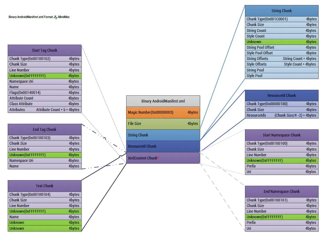 弄过反编译的同学都知道AndroidManifest在apk中是以二进制形式存在的。也是有固定的存储格式的。这样做是为了减少apk的大小。而关于文件格式,我在之前的文章也做了详细介绍,不了解的同学可以去网站查找相对应的资料。而且再次说明。一定要看明白这篇文章,不然本文会看的很吃力。而这篇文章其实是借助了看雪大神MindMac的一张神图: