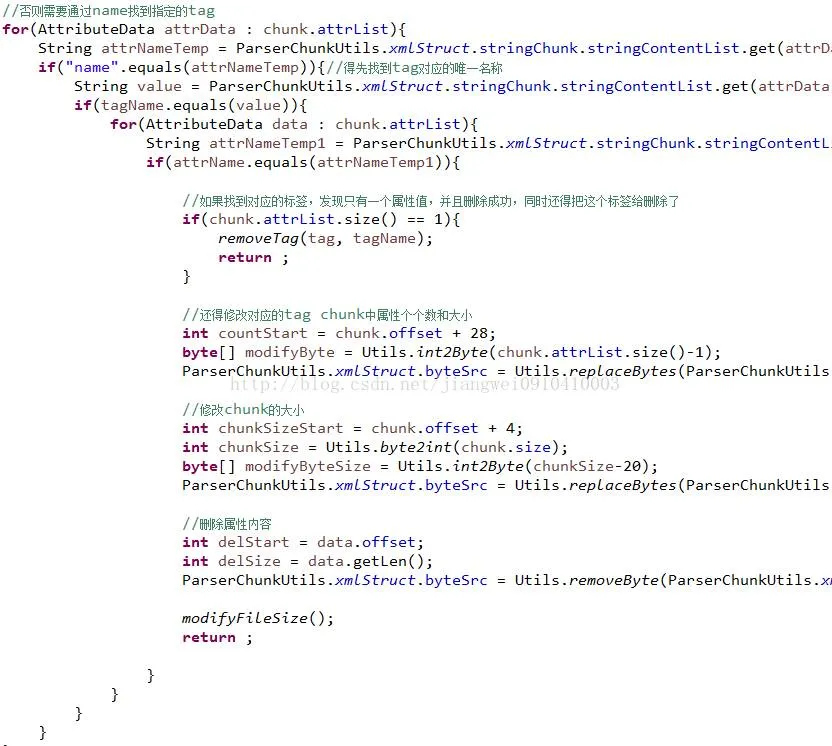 这个其实和属性块删除操作非常类似,找到标签块直接删除即可。然后修改文件大小。比删除属性还要简单点。不过这里需要注意了,在AndroidManifest.xml中存在两种标签,一种是和application标签平级的,比如权限标签,一种是在application标签中的。而在删除一个标签必须还需要id值,也就是name属性值,所以我们还需要获取到这个标签块的属性值,才能找到对应的标签块。而且在删除一个标签块必须删除开始块和结束块。
